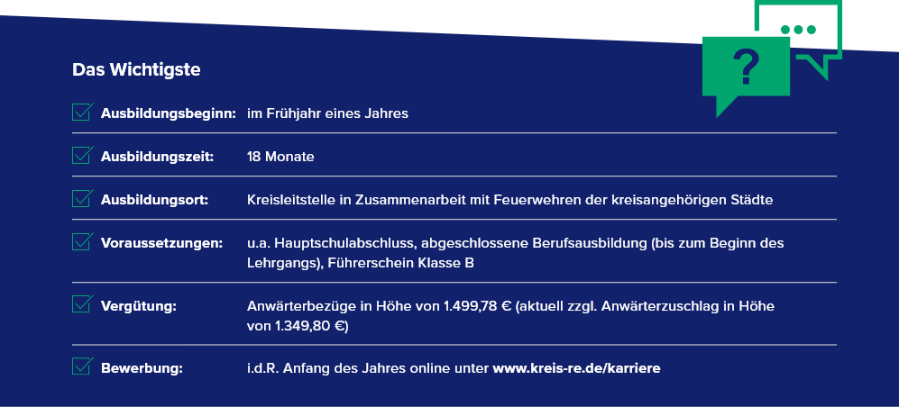 Bei allgemeinen Fragen zur Ausbildung wende dich gern per E-Mail an das Ausbildungsteam (ausbildung@kreis-re.de) oder telefonisch an Frau Kliem (Ausbildungsleitung, 02361-53 4400) und bei fachlichen Fragen an Herrn Wehrhagen (Leiter der Kreisleitstelle, 02361-9394 0).Übrigens: Bewerbungen geeigneter Menschen mit einer Schwerbehinderung sind erwünscht. Unsere Stellenausschreibungen wenden sich ausdrücklich auch an Menschen mit Migrationshintergrund.