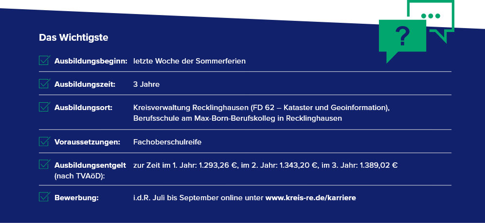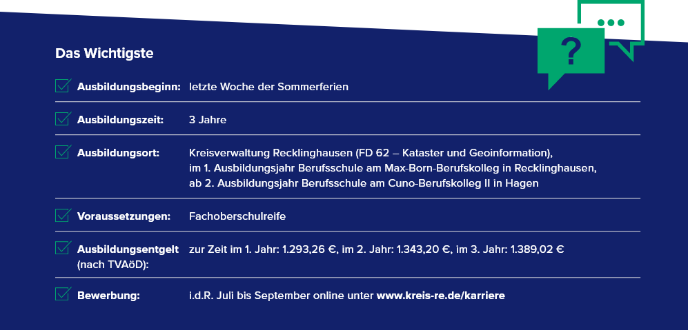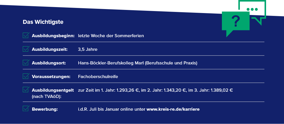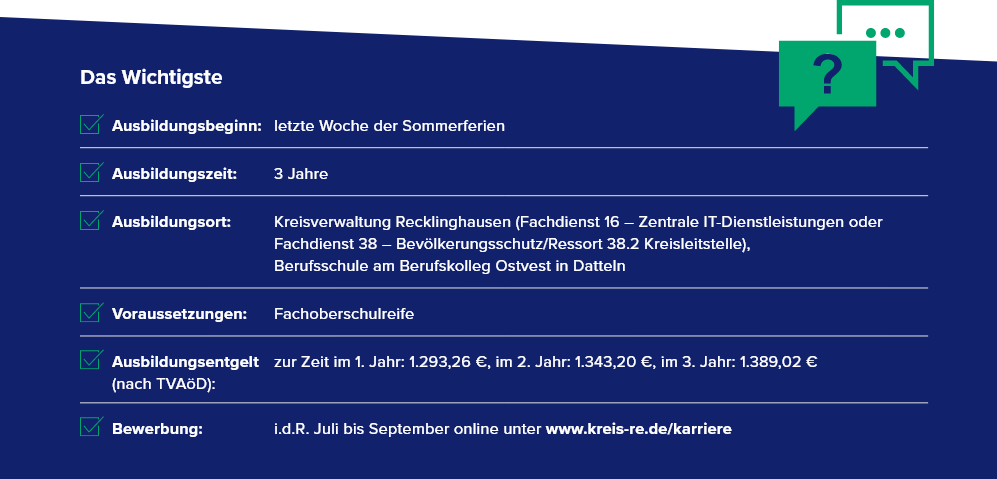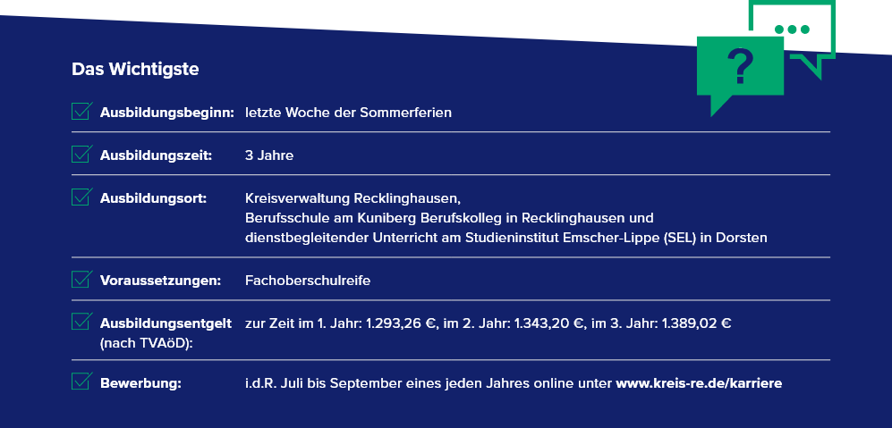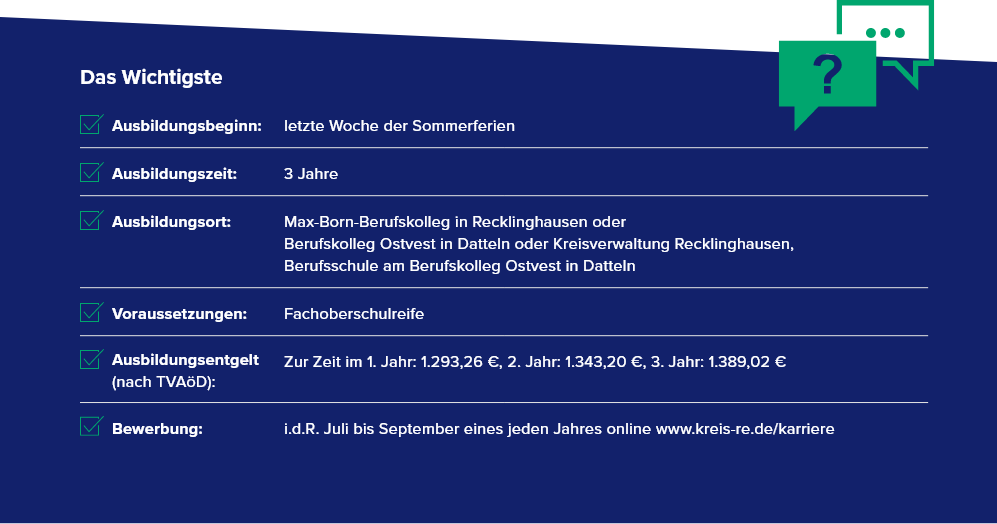 Bei allgemeinen Fragen zur Ausbildung wende dich gern per E-Mail an das Ausbildungsteam (ausbildung@kreis-re.de) oder telefonisch an Frau Kliem (Ausbildungsleitung, 02361-53 4400).