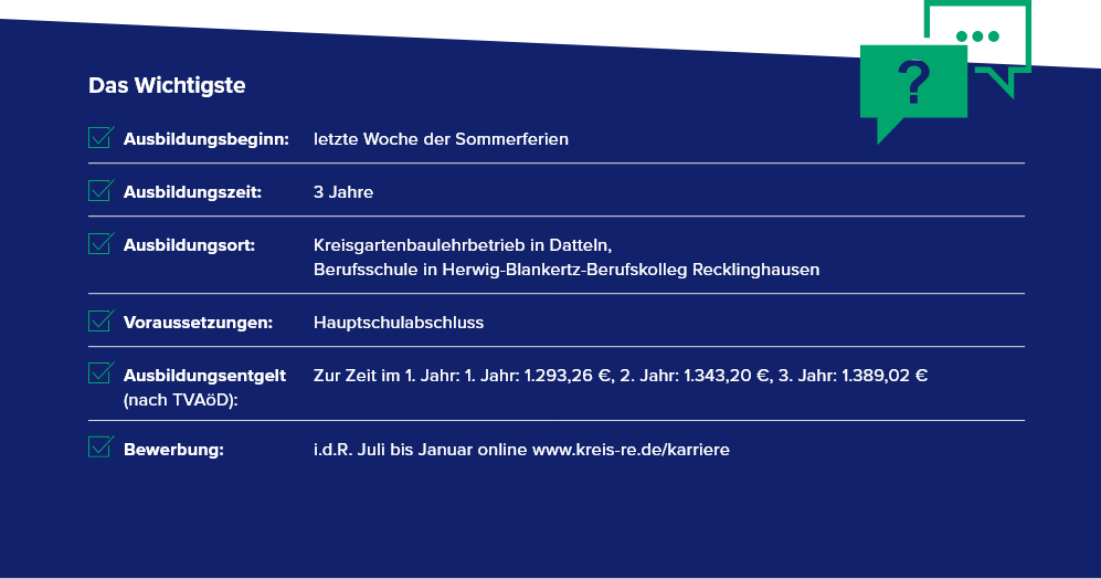 Bei Fragen zur Ausbildung wende dich gern per E-Mail an das Ausbildungsteam (ausbildung@kreis-re.de) oder telefonisch an Frau Kliem (Ausbildungsleitung, 02361-53 4400) und bei fachlichen Fragen an Herrn Winhard (Leiter des Kreisgartenbaulehrbetriebes, 02363-61034 oder f.winhard@kreis-re.de).Übrigens: Bewerbungen geeigneter Menschen mit einer Schwerbehinderung sind erwünscht. Unsere Stellenausschreibungen wenden sich ausdrücklich auch an Menschen mit Migrationshintergrund.