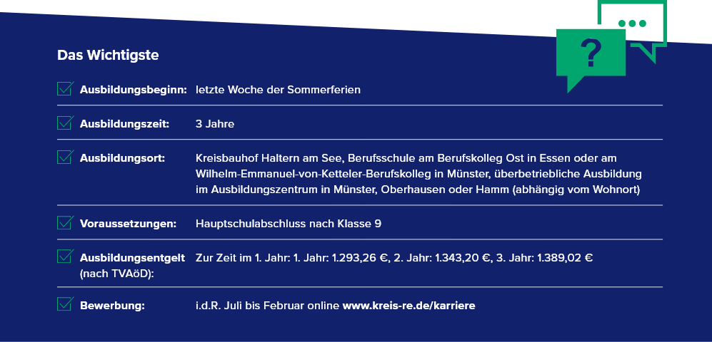 Die Ausbildung als Straßenbauer*in dauert insgesamt drei Jahre und erfolgt Stufenweise. Nach den ersten beiden Ausbildungsjahren schließt du bereits die erste Stufe deiner Ausbildung mit der Prüfung als Tiefbaufacharbeiter*in mit dem Schwerpunkt Straßenbauarbeiten ab. Direkt danach folgt die zweite Stufe, die das dritte Ausbildungsjahr umfasst. Diese wird dann mit der Gesellenprüfung als Straßenbauer*in abgeschlossen.Der betriebliche Teil der Ausbildung findet am Kreisbauhof in Haltern-Lippramsdorf (Ostendorfer Str. 45) statt. Der überbetriebliche Teil hingegen findet am Lehrbauhof Münster oder am Ausbildungszentrum des Berufsförderungswerks der Bauindustrie NRW in Oberhausen oder Hamm statt (abhängig von deinem Wohnort). Zusätzlich findet der schulische Teil deiner Ausbildung wöchentlich am Wilhelm-Emmanuel-von-Ketteler-Berufskolleg in Münster oder am Berufskolleg Ost in Essen statt (auch das ist abhängig von deinem Wohnort).
