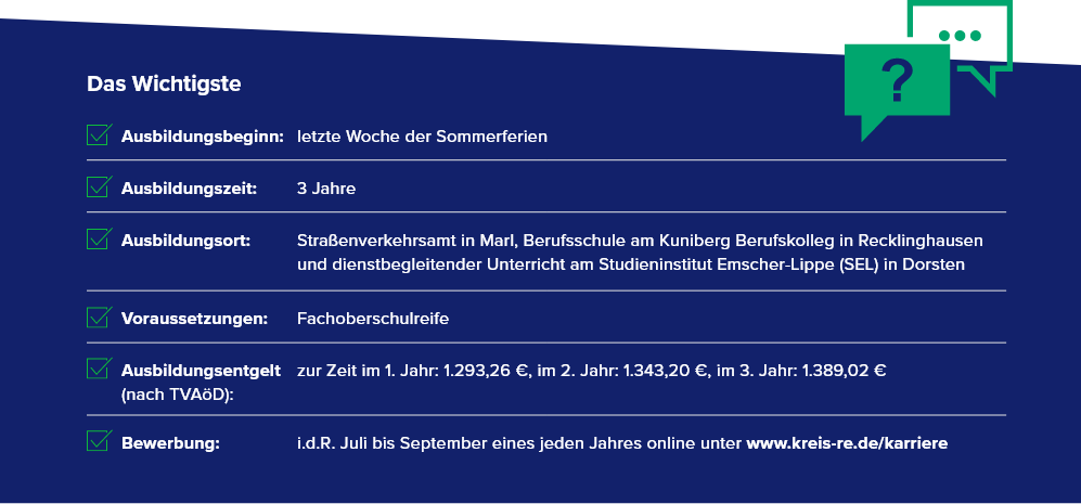 Es ist beabsichtigt, dich nach erfolgreichem Abschluss deiner Ausbildung in einem der dir bekannten Bereiche des Straßenverkehrsamtes in Marl einzusetzen. Du merkst schon: Während deiner Ausbildung wirst du genau darauf intensiv vorbereitet.