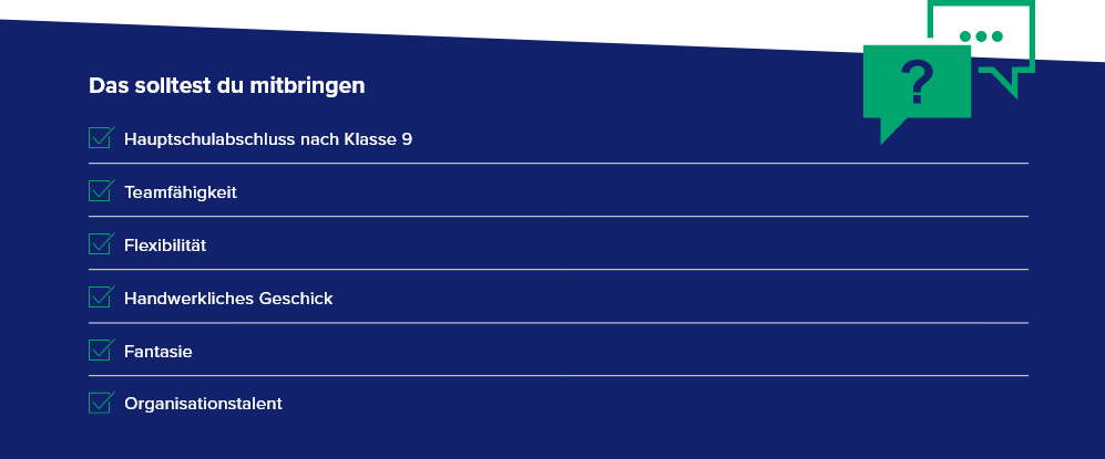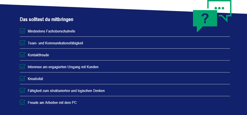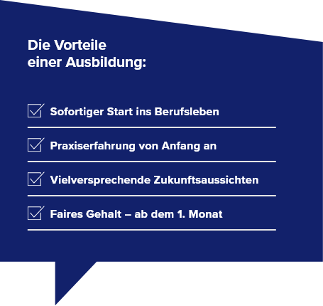 Ein sogenanntes duales Studium verbindet die praktische Ausbildung mit den zusätzlichen theoretischen Grundlagen eines Studiums – mitunter stehen am Ende sogar zwei Abschlüsse! Durch ein duales Studium kannst du dich fachlich noch breiter aufstellen und auch früher für besondere Positionen qualifizieren. Voraussetzung ist in der Regel die volle Fachhochschulreife.
