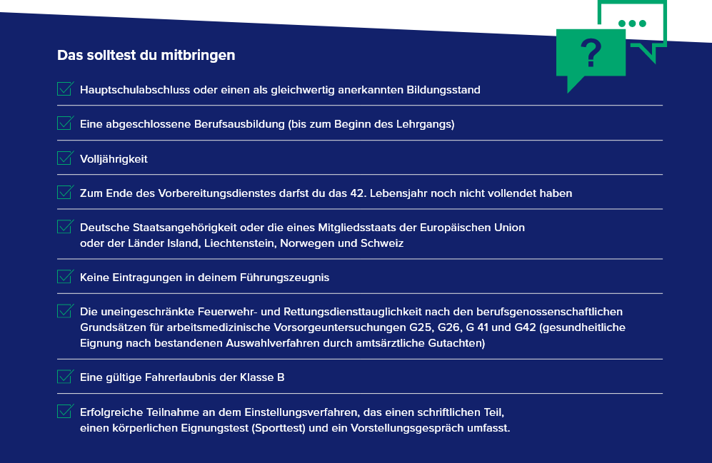 Deine Ausbildung endet mit der Laufbahnprüfung für das zweite Einstiegsamt der Laufbahngruppe 1 des feuerwehrtechnischen Dienstes im Land Nordrhein-Westfalen. Nach Abschluss der Ausbildung kannst du als ausgebildete*r Brandmeister*in bei allen hauptamtlichen Feuerwehren tätig werden.