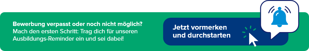 Hast du die Bewerbungsfrist für deine Wunsch-Ausbildung im Jahr 2026 verpasst? Trag dich jetzt schon mal in unseren Ausbildungs-Reminder weiter unten auf der Seite ein und behalte unsere Webseite regelmäßig im Blick!
