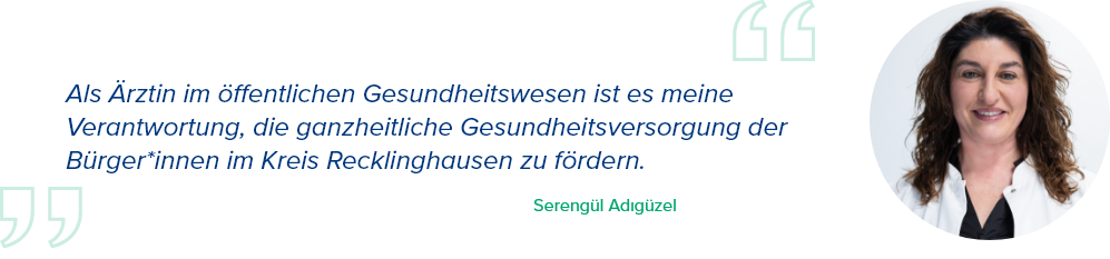 Um sich im öffentlichen Gesundheitsdienst voll einzubringen, hat sich die Fachärztin für Chirurgie während ihrer Arbeit beim Kreis zusätzlich zur Fachärztin für öffentliches Gesundheitswesen qualifiziert. Neben einer guten Atmosphäre und Zusammenarbeit im Team schätzt Serengül Adigüzel vor allem ihren abwechslungsreichen Arbeitsalltag und eine gesündere Work-Life-Balance im Gegensatz zur Klinik. So ist sie nicht nur am Schreibtisch oder im Untersuchungszimmer tätig, sondern auch in den Bezirksstellen des Gesundheitsamtes im Kreisgebiet unterwegs, um sich mit ihren Kolleg*innen über medizinische Fälle auszutauschen.